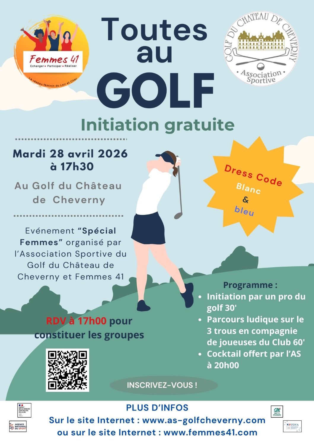 Femmes 41 et l’Association Sportive du Golf de Cheverny ont le plaisir de vous inviter à “Toutes au golf”, une soirée d’initiation gratuite dédiée aux femmes, le mardi 28 avril 2026 de 17h30 à 20h30 au Golf du Château de Cheverny